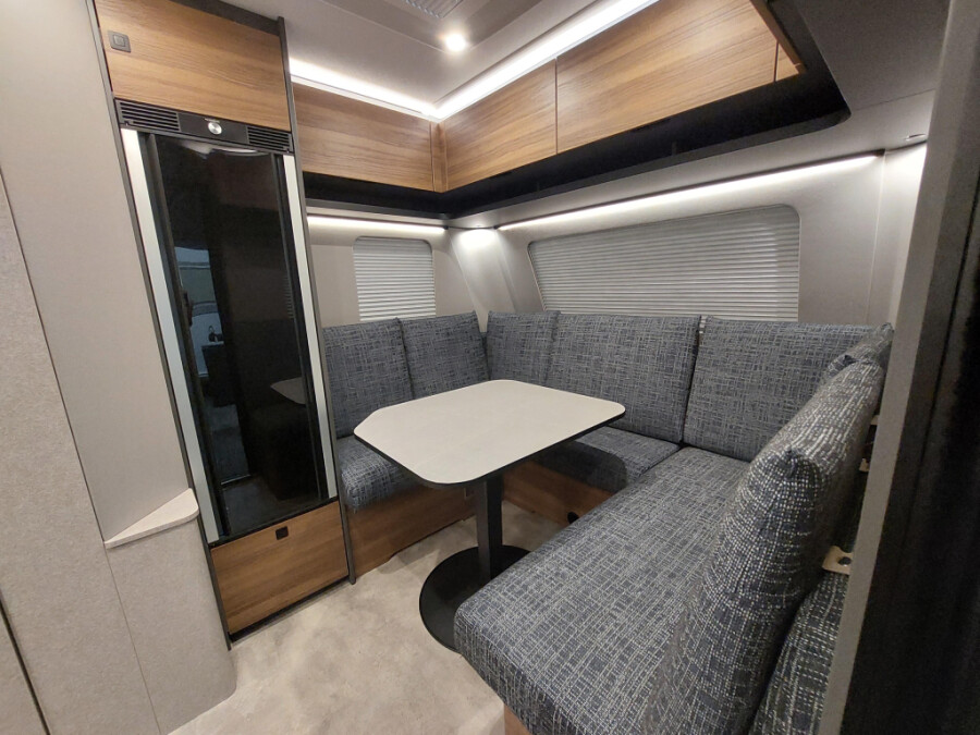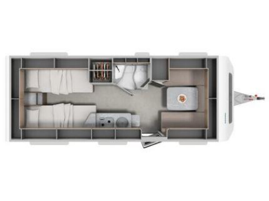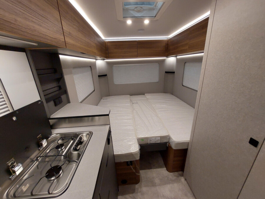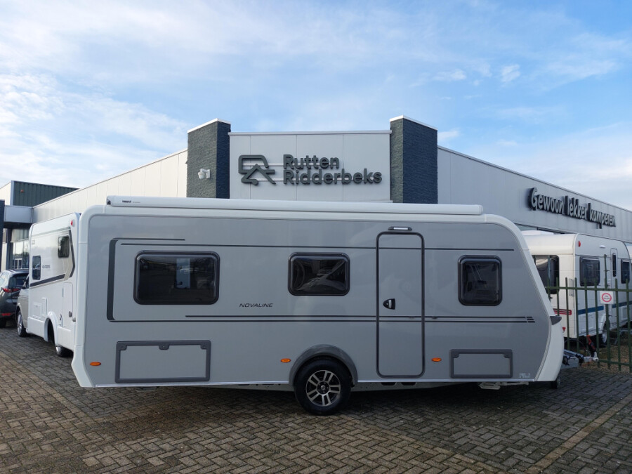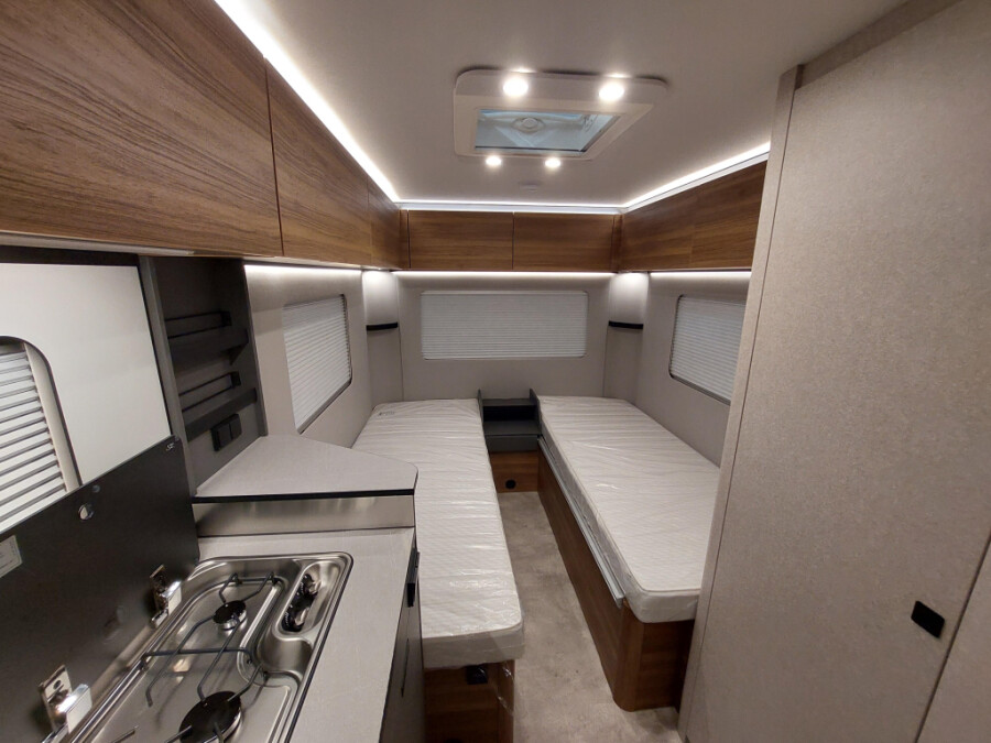 Deze caravan is uitgerust met onderstaande opties:15' reservewiel met lichtmetalen velg Ambient light XL Anti-slingersysteem Bekledingsstof Treviso Lake Comfortkussen voor de zitgroep voor Dakluifel Thule Omnistor 6300 met adapter, behuizing wit, 450 x 250 cm (uitbreidbaar met zicht-, wind- en regenbescherming) Disselneuswiel met geïntegreerde kogeldrukmeter Douchebak inlegvloer in betonlook Elegance Pakket II Meubeldecor Biarritz Moving Pakket Openslaande achterruit met comfortabele plisségordijnen en ventilatieverstelling Rolbare lattenbodem tussen de eenpersoonsbedden (incl. extra kussen) Serviceluik achter in rijrichting links, 100 x 40 cm Serviceluik voor in rijrichting rechts, 75 x 30 cm Technisch toegestane maximum massa naar 1.800 kg Truma Combi-4 E gaskachel Vloertemperatuurregeling (elektrisch) in het woongedeelte en middenpad